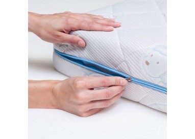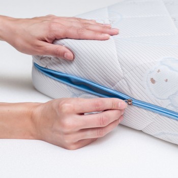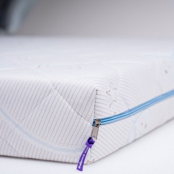 Чехол выполнен из прочной трикотажной ткани в составе которой содержится хлопок. Ткань простегана по технологии глубокой стежки. Особая техника стёжки позволяет равномерно, без потери формы и объёма, зафиксировать все составляющие чехла. Хлопковые нити в составе ткани обеспечивают здоровый микроклимат во время сна. Чехол имеет молнию, что позволяет стирать его в домашних условиях.
